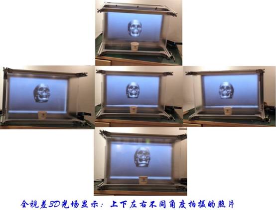 右邊展示的是最前沿的全視差3D光場顯示技術,通過光學技術的應用,實現了180°的多角度3D影像播放。舉個例子,對于普通3D電影而言,無論您在電影院的哪個位置觀看,您所看到的景象是一樣的。但如果采用此項技術,您在不同的位置和角度可以看到不同的圖像。看圖片中展示的骷髏頭,您如果從左邊看,那您能看到的是它的右臉;從右邊看,那您看到的是它的左臉;如果您從下面看,您還能看到它的下巴。此項技術屬于全息投影技術的一種,仍在深入研發中,但必將對以后的觀影方式產生重大影響。